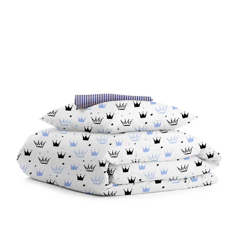 | Цвет: | Пододеяльник - Короны светло-синие, серые и черные/оборот Полоса синяя | Наволочка - Короны светло-синие, серые и черные | Простынка - Полоса синяя |