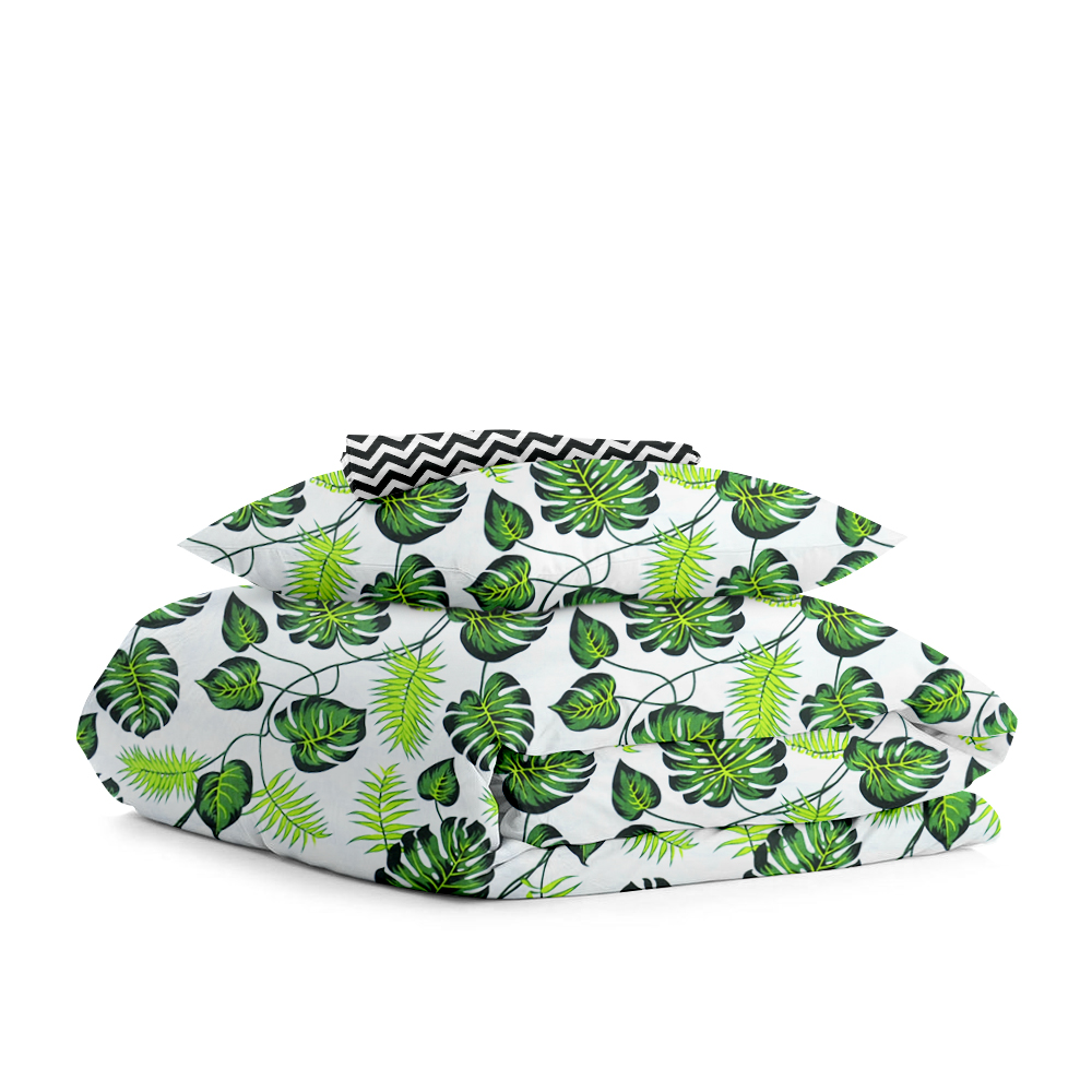 | Цвет: | Пододеяльник - Пальмовые листья / Зигзаг черно-белый Наволочка - Пальмовые листья Простынка - Зигзаг черно-белый |