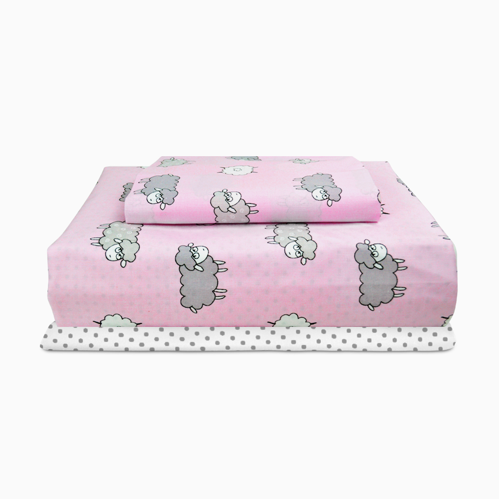| Цвет: | Пододеяльник - Барашки на розовом/оборот горох серый на белом Наволочка - Барашки на розовом Простынка - Горох серый на белом |